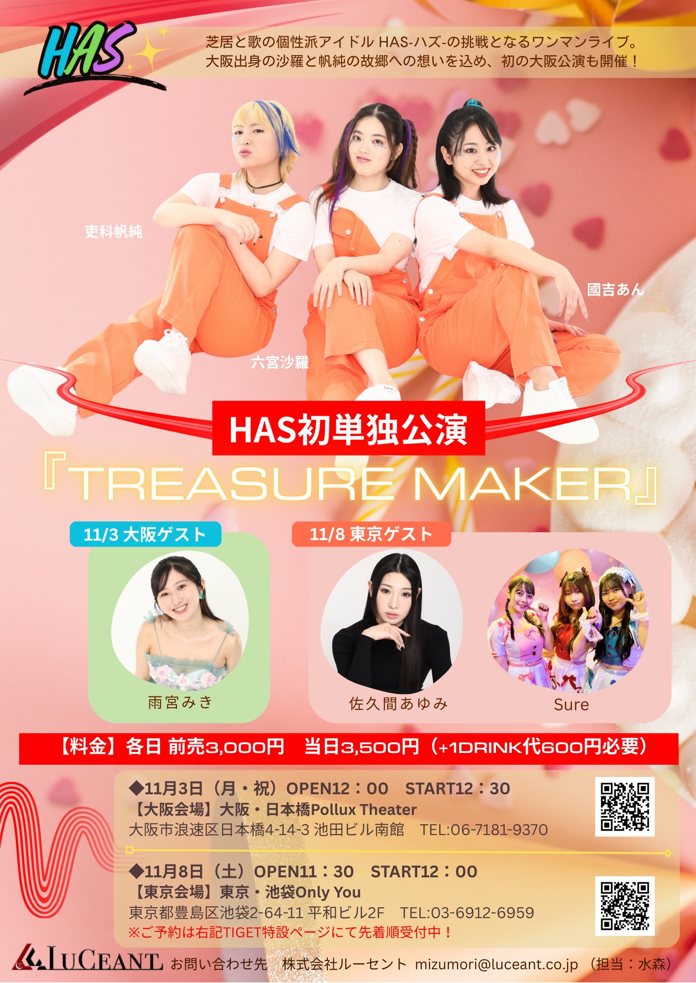 2025.5.25始動。ルーセント初の歌と芝居のアイドルユニットHAS-ハズ-が誕生!Haveの複数形”持ってる”の意とメンバーのイニシャルの頭文字を組み合わせて命名。沖縄出身のあん、大阪出身のほずみ、サラの3人組の異色アイドル。